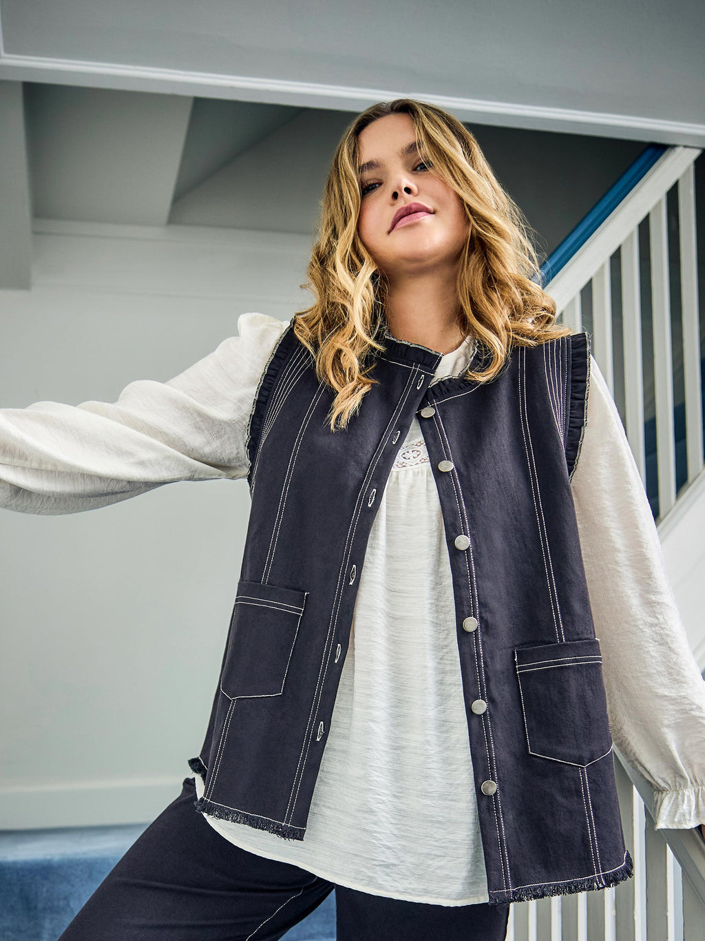 Denne stilfulde top i kraftig sort denim er designet til at fungere både som top og vest. De dybe ærmegab gør den perfekt til at style over din yndlingsbluse eller -kjole. Feminine flæsedetaljer ved ærmegab og halsudskæring giver et legende udtryk, mens mørke sølvfarvede denimknapper giver en elegant lukning. Afsluttet med kontrastsyninger i creme, der tilfører et moderne twist.Kraftig sort denimKan bæres som top eller vestDybe ærmegab – ideel til lag-på-lagFlæsedetaljer ved ærmegab og halsudskæringMørke sølvfarvede denimknapperKontrastsyninger i creme
