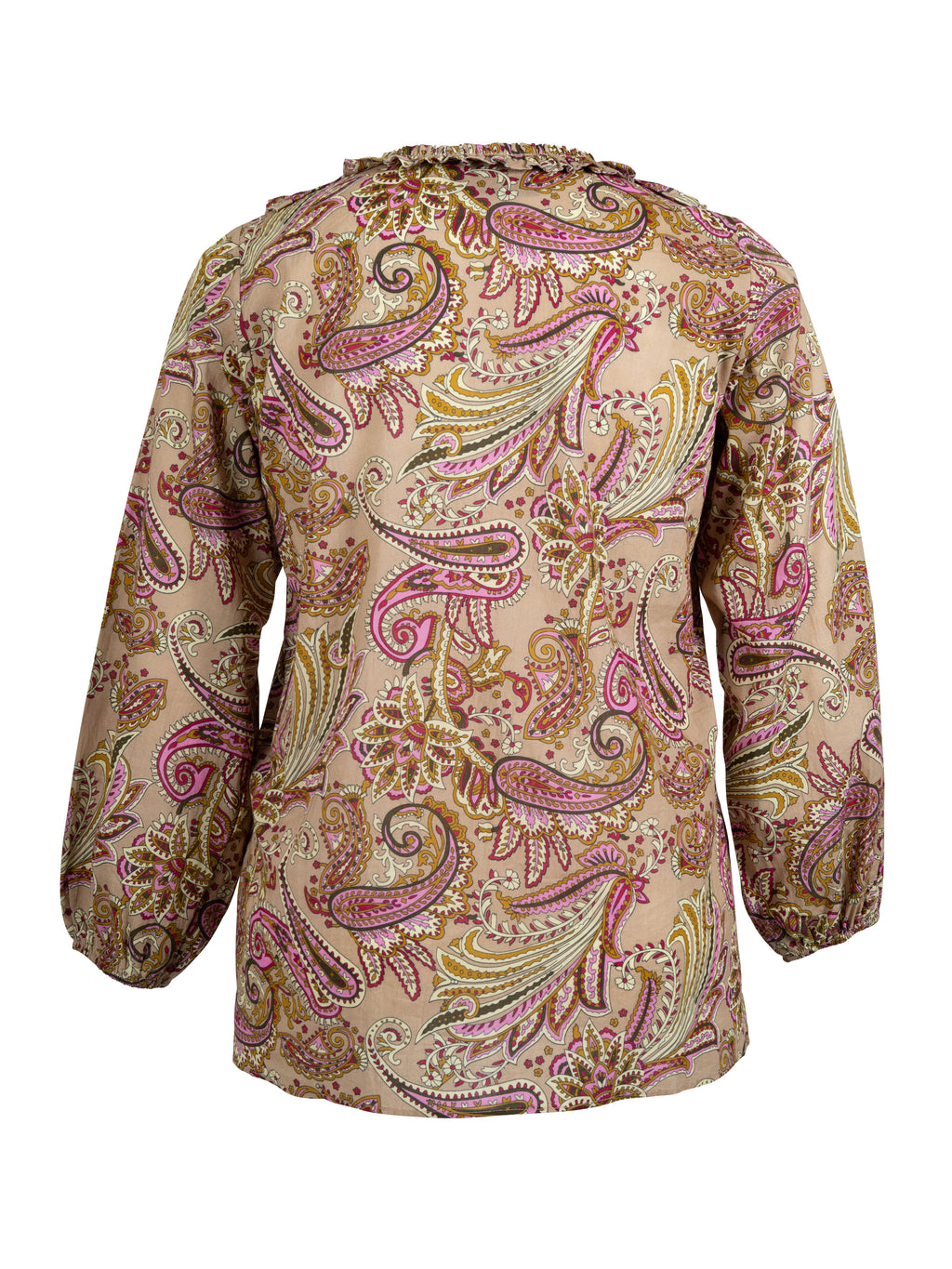 Denne feminine bluse er lavet af 100% let bomuld med et elegant paisleymønster i varme beige nuancer, fremhævet af pink og gule detaljer. Den har en flæsekantet halsudskæring med bindebånd, der giver et legende og romantisk udtryk. De lange ærmer afsluttes med elastiske manchetter, som giver blusen en afslappet, men stadig raffineret silhuet. Nem at style med jeans til et afslappet look eller med bukser og nederdele til en mere elegant anledning.Let materiale med paisleymønsterFlæsekantet halsudskæring med bindebåndLange ærmer med elastiske manchetterAfslappet pasformFeminint og alsidigt design