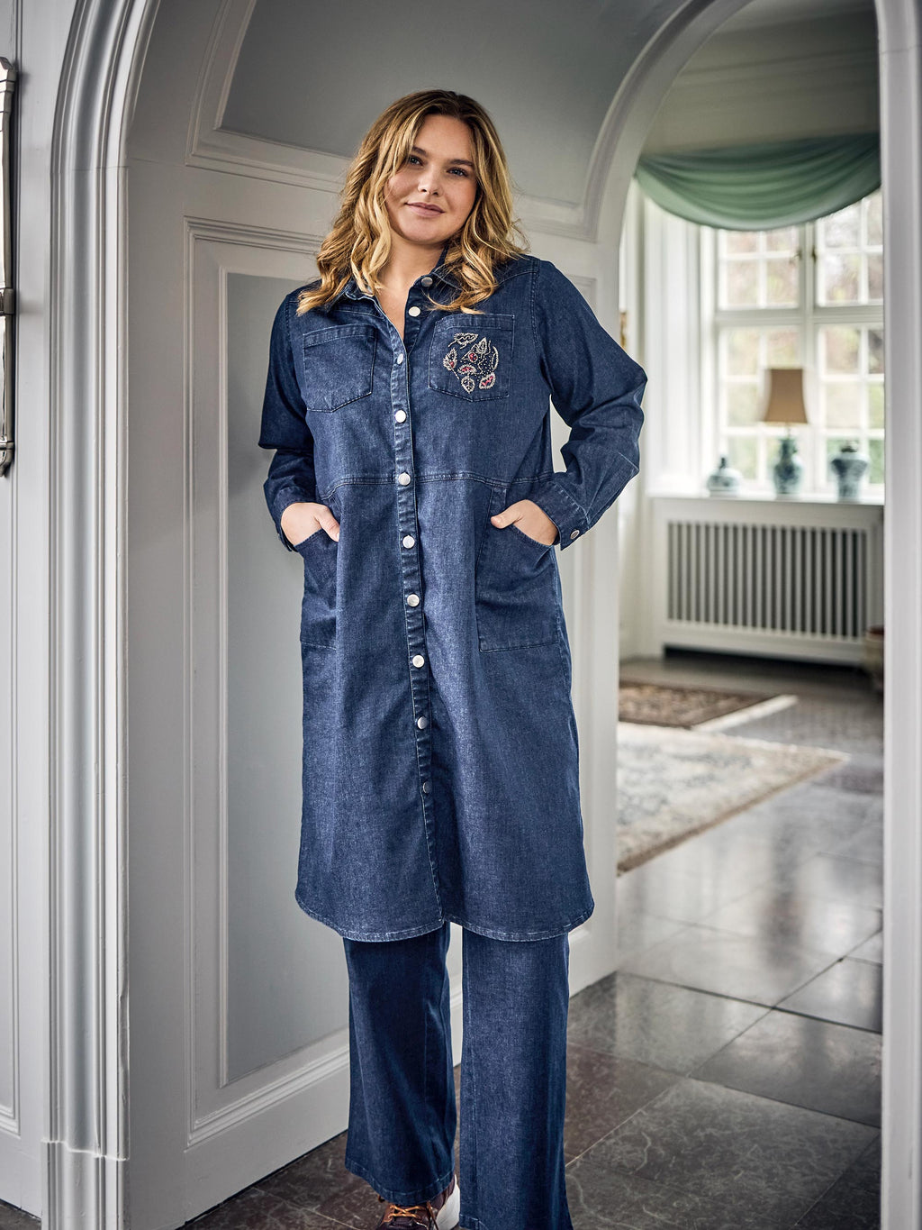 De smukke Eda Pants i blød denim kombinerer komfort og elegance i et moderne snit, der giver en flatterende pasform og gør dem til et uundværligt basisitem i enhver garderobe. Eda Pants er fremstillet i et blødt og strækbart materiale, der føles behageligt mod huden og giver fuld bevægelsesfrihed. Den tidløse silhuet med lige ben gør bukserne lette at style til både hverdag og fest, mens elastikken i buksernes bagerste linning gør dem ekstra behagelige at have på hele dagen. Bukserne har en klassisk gylp, for- og bag-lommer samt bæltestropper.Brug dem med en enkel t-shirt og sneakers for et afslappet look, eller med en elegant bluse og hæle for et mere sofistikeret outfit. Disse plus size bukser fra ZOEY er perfekte til dig, der ønsker både komfort og stil i ét design. Uanset om det er til arbejde, fritid eller en aften ude, er Eda Pants et sikkert valg, der giver dig selvtillid og velvære hele dagen. - Moderne plus size bukser i str. 38-56 -Blødt og strækbart materiale med høj komfort - Flatterende pasform med tidløs silhuet- Perfekte til både hverdag og fest - Let at style med både bluser, skjorter og toppe