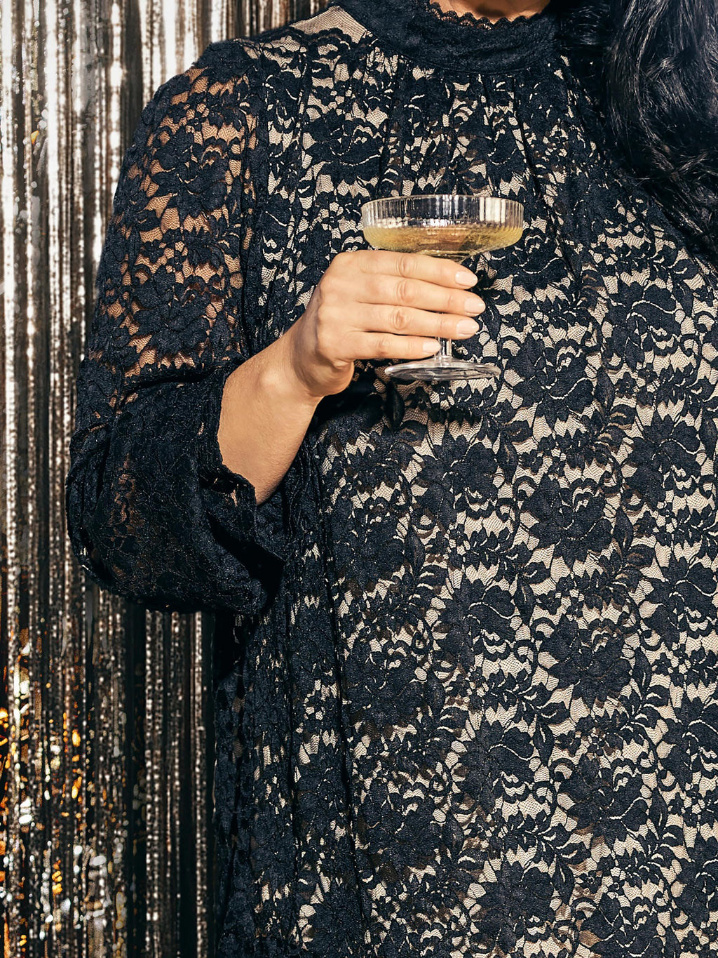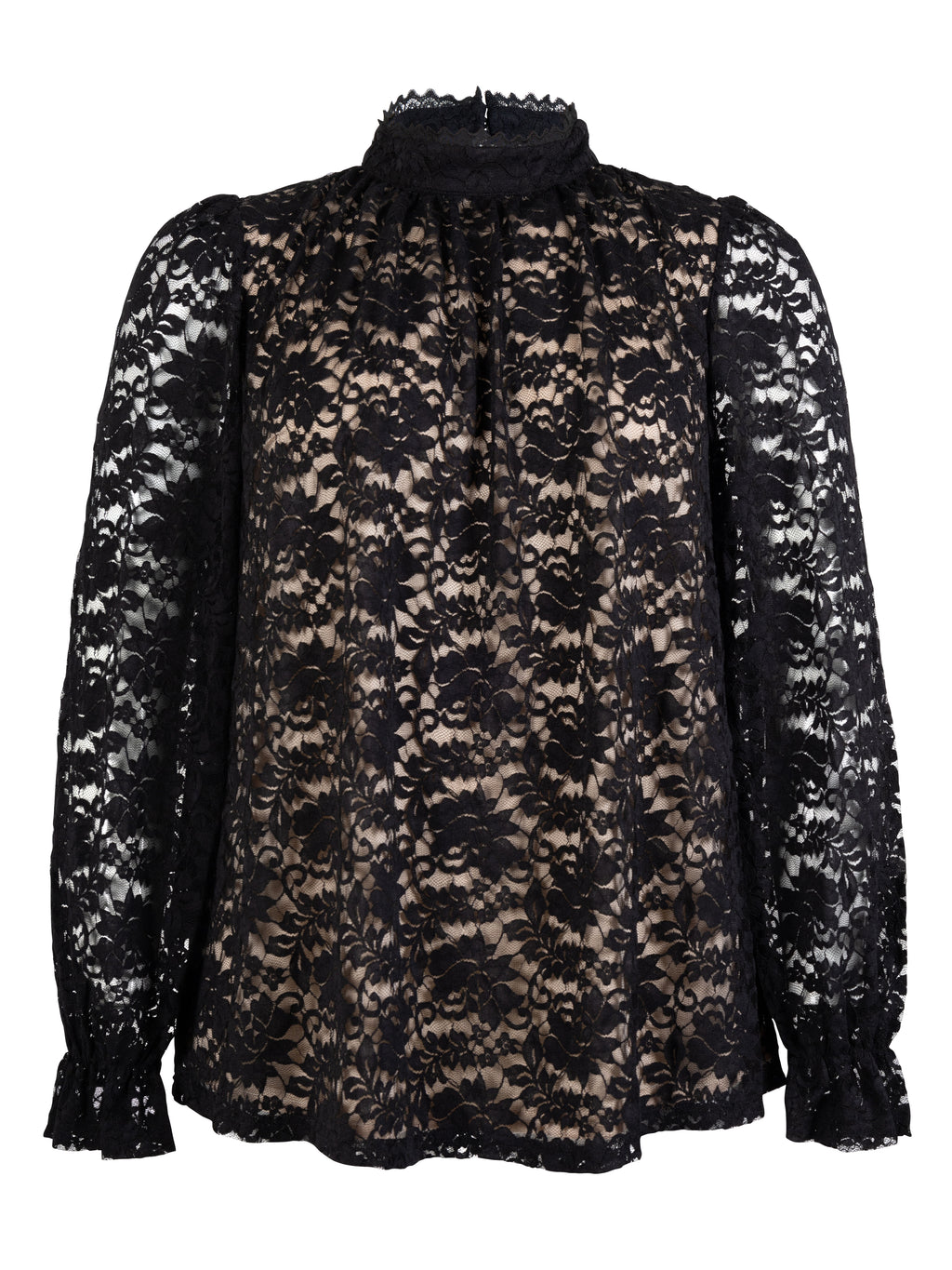 Denne elegante top med fine blondedetaljer, giver et romantisk twist til dit outfit. Blusen har elastik i ærmerne, som giver en smuk afslutning med let volumen, og en lukning i nakken, der tilføjer et raffineret touch.Fremstillet i et let og strækbart materiale, som sikrer både komfort og bevægelsesfrihed.- Plus size bluse i str. 38–56- Let materiale med stræk- Blondedetaljer og feminine ærmer- Lukning i nakken- Ideel til både hverdag og fest