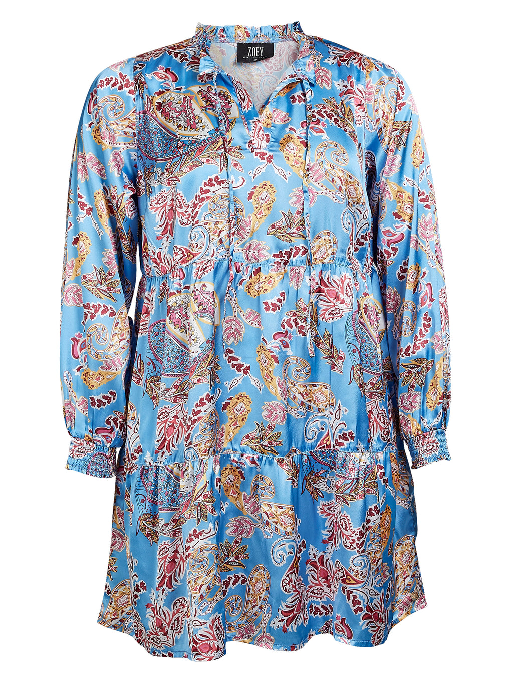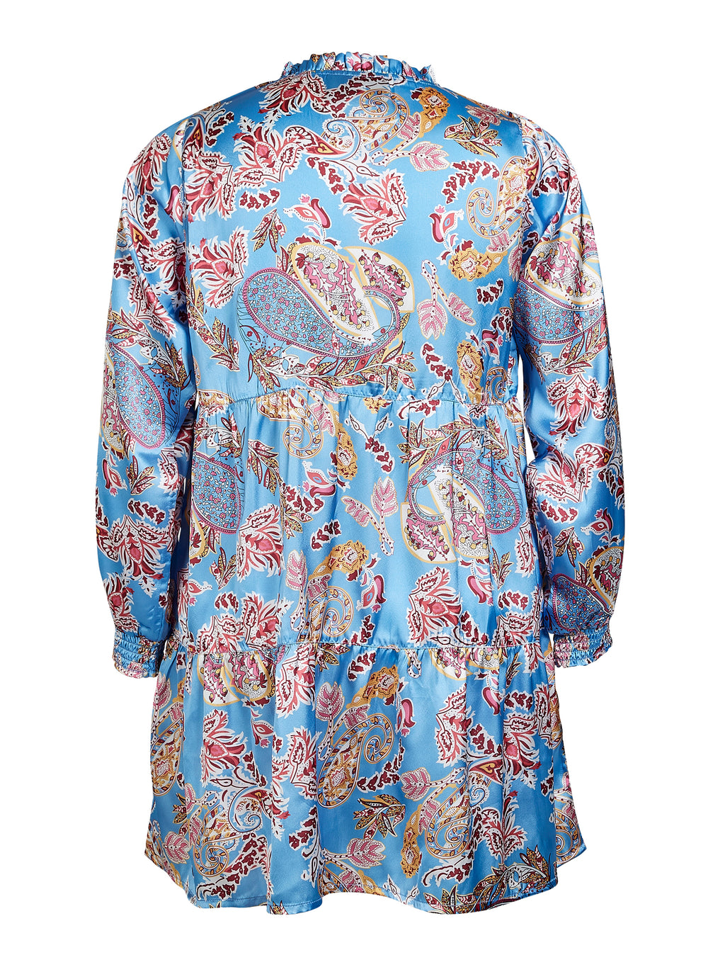 Opgrader din garderobe med denne smukke kjole i en klar blå nuance, prydet med et farverigt paisley- og blomsterprint i varme toner. Kjolen har en løs og komfortabel pasform med et feminint fald, lange ærmer med elastiske manchetter og en flatterende V-udskæring med lille ståkrave. Det lette, glatte stof giver et eksklusivt look og føles behageligt mod huden. Perfekt til både hverdagsbrug og festlige lejligheder – style den med sandaler for et afslappet udtryk eller med støvler og accessories for et mere sofistikeret look.• Klar blå med multicolor paisleyprint• Let og glat kvalitet • Løs og behagelig• Lange med elastiske manchetter• V-udskæring med ståkrave