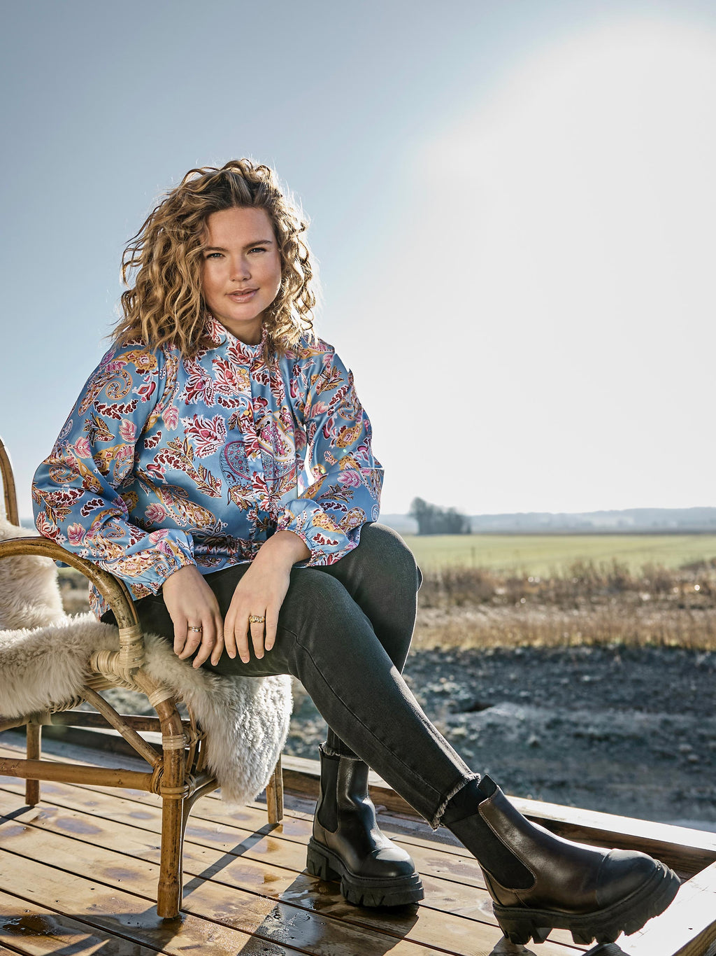 Tilføj et strejf af luksus til din garderobe med denne elegante skjorte i en klar blå nuance, dekoreret med et farverigt paisley- og blomsterprint. Skjorten er fremstillet i et glat, let materiale med smuk satin-effekt, der giver et eksklusivt look og en behagelig følelse mod huden. Den har lange ærmer med løs pasform, klassisk knaplukning foran og en stilfuld ståkrave, der fuldender det feminine design. Perfekt til både hverdag og fest – style den med jeans for et afslappet udtryk eller med elegante bukser for et sofistikeret look.• Klar blå med multicolor paisleyprint• Let og glat kvalitet med satin-effekt• Løs og komfortabel• Lange med afslappet vidde• Knaplukning foran• Hals: Ståkrave